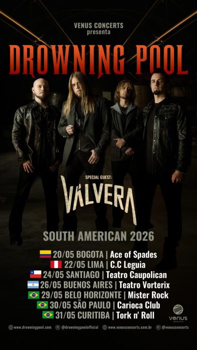 A banda norte-americana Drowning Pool, cuja música “Bodies” é há mais de 20 anos um dos maiores hits do nu metal mundial, volta à América Latina em maio para uma série de shows, que inclui três no Brasil: 29/05 no Mister Rock (Belo Horizonte), 30/05 no Carioca Club (São Paulo, saiba mais aqui, com produção da ND Productions e Powerline) e 31/05 no Tork n’ Roll (Curitiba).