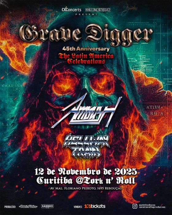 No dia 12 de novembro, a lenda do heavy metal alemão, Grave Digger, e o emergente grupo sueco Ambush se apresentam no palco do Tork n’ Roll, em Curitiba. A união de uma das maiores bandas do heavy metal de todos os tempos, com um dos nomes mais importantes da nova geração do estilo, é uma verdadeira celebração à música pesada. Apesar da grande procura, ainda há ingressos disponíveis, a partir de 190 reais (pista comum, meia). Os convites do show – uma realização Xaninho e Caveira Velha – podem ser adquiridos pela 101 Tickets.