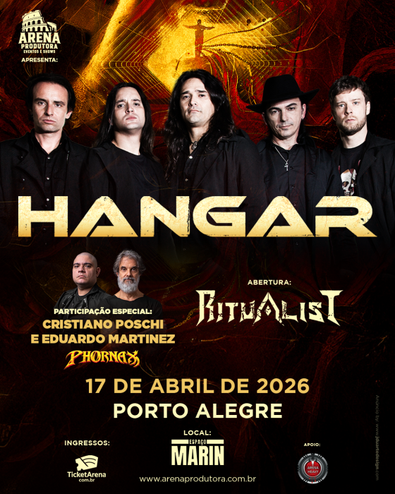 Formado no final dos anos 1990, o Hangar construiu uma das trajetórias mais sólidas e respeitadas da música pesada brasileira. Unindo técnica apurada, peso e melodias marcantes, a banda lançou álbuns aclamados que se tornaram referência no Power e Heavy Metal sul-americano. Celebrando esse legado e marcando o aguardado reencontro com os fãs gaúchos, o grupo prepara um repertório muito especial que revisita seus clássicos. A atual formação da banda conta Pedro Campos (@pedrocamposvoz) no vocal, Cristiano Wortmann (@cristianowortmann) e Guto Gibson (@gutogibson) nas guitarras, Fabio Laguna (@fabio_laguna) nos teclados, Nando Mello (@nando_mello) no baixo e Aquiles Priester (@aquilespriester) na bateria. Para tornar a apresentação ainda mais memorável, o show do Hangar contará com a participação especial de Cristiano Poschi e Eduardo Martinez (ex-Hangar e Panic), respectivamente vocalista e guitarrista do Phornax, que subirão ao palco para somar forças com o sexteto.