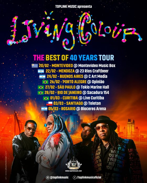 O Living Colour inicia nesta semana a turnê sul-americana “The Best Of 40 Years Tour”, série de shows que celebra os 40 anos de carreira da banda e marca seu retorno à região. A estreia da turnê acontece em 20 de fevereiro, em Montevidéu (Uruguai), antes de seguir para Argentina, Brasil e Chile, com produção da Top Link Music.