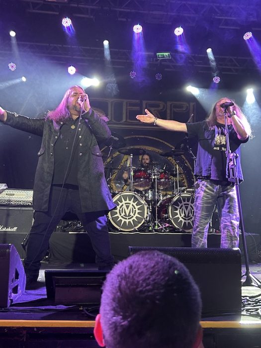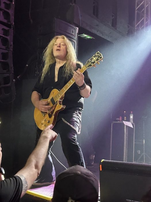 Em relação à formação atual, além do nosso querido “Rolando” (como se reconheceu ao ser chamado assim carinhosamente por um fã no meio do show), e de Jari, completam a banda o tecladista alemão Axel Mackenrott (único da formação original), o vocalista sueco Rick Altzi (também vocalista da banda alemã At Vance) e o baterista brasileiro Marcus Dotta (da brasileira The Heathen Scythe, da alemã Metalium, entre outros), que na turnê latino-americana estava substituindo o baterista alemão Kevin Kott (também do At Vance). Escalação feita, pontualmente às 21h30, a banda abriu com “Rise Again”, single de 2024 que marcou o retorno da banda nesta formação atual. Um power metal com todas as características que fizeram de Grapow uma referência no estilo, mas que teve pouca divulgação no meio, o que se percebeu pela pouca resposta do público ao som.