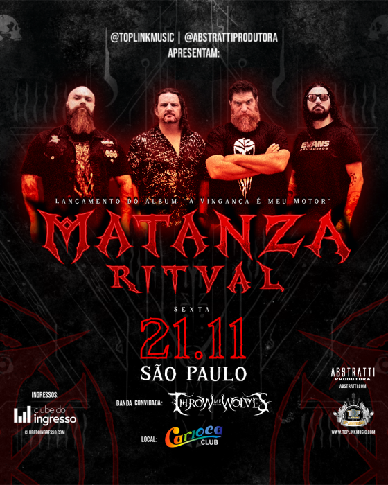 O Matanza Ritual se apresenta pela primeira vez no palco do Carioca Club, em São Paulo, no dia 21 de novembro, a partir das 20h, com show de lançamento do seu primeiro álbum, “A Vingança é Meu Motor”. Na ocasião, a banda apresentará músicas que fizeram sucesso com a voz de Jimmy London no Matanza.