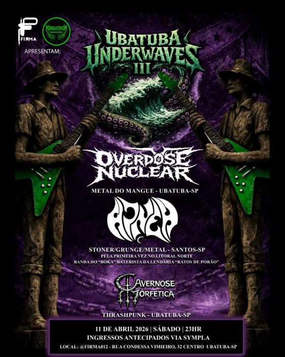 A apresentação de sábado ocorre em um evento promovido pela Firma e Manguedoom Produções. Em sua terceira edição, o Ubatuba Underwaves marca a primeira apresentação da Apnea (@apneaband) (Santos/SP) na região. O grupo, focado nas vertentes Stoner, Grunge e Metal, é formado por nomes emblemáticos da cena independente nacional, incluindo Boka (@bokardp), baterista do Ratos de Porão. O line-up do evento é completado pela banda local Cavernose Morfética (@cavernosemorfetica), voltada ao Thrashcore.