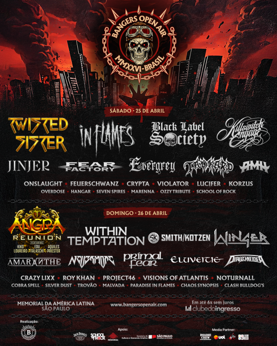 O Bangers Open Air 2026 será realizado nos dias 25 e 26 de abril, no Memorial da América Latina, em São Paulo. O festival promoverá um encontro simbólico entre passado e presente do ‘Angraverso’, celebrando a história, a superação e a constante reinvenção de uma das bandas mais influentes e criativas do heavy metal brasileiro. Um show exclusivo e um marco definitivo na trajetória do Angra, que ficará para sempre na memória dos fãs e no legado do festival.