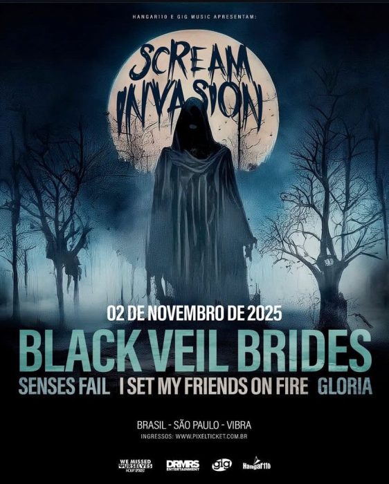 O Scream Invasion, novo festival em São Paulo/SP que acontece dia 2 de novembro, leva ao palco do Vibra SP as bandas internacionais Black Veil Brides, Senses Fail, Set My Friends on Fire, além da nacional Gloria. A realização é da Gig Music junto ao Hangar 110. Ingressos: pixelticket.com.br/eventos/ Black Veil BridesFormada em 2006 em Cincinnati (Ohio, EUA), mas atualmente sediada em Hollywood (Califórnia), Black Veil Brides tornou-se conhecida tanto pelo som que mistura elementos de hard rock, metal e glam, quanto pela estética teatral (maquiagem pesada, roupas escuras e cabelo estilizado). Seu álbum de estreia, ‘We Stitch These Wounds (2010)’, já atraiu atenção de fãs e mídia ao redor do globo, seguido por ‘Set the World on Fire’ (2011) e outros trabalhos que consolidaram sua base de fãs internacionais. Recentemente, ganharam o “Rock Sound 25 Icon Award” da importante revista britânica Rock Sound. Senses FailAtiva desde 2002, a banda de New Jersey (EUA) é liderada por James “Buddy” Nielsen, membro constante desde a fundação. Seu som transita entre post-hardcore, emo e screamo, com fortes mudanças de estilo ao longo dos anos. ‘If There Is Light, It Will Find You’, o sétimo álbum de estúdio da banda, é um dos grandes sucessos, que alcançou o número 57 na Billboard 200. I Set My Friends On FireFormado em 2007 em Miami (EUA), a banda é reconhecida por sua abordagem experimental, mesclando post-hardcore, elementos eletrônicos, metalcore e screamo, com letras que refletem sobre a vida “desplugada” da internet. Nos primeiros anos de carreira, o MySpace chegou a remover a página da banda porque o número de plays era considerado “impossível”. Após o sucesso online, a banda assinou com a gravadora Epitaph Records, pela qual lançou álbuns como ‘You Can’t Spell Slaughter Without Laughter’ (2008) e ‘Astral Rejection (2011)’. GloriaFormada em 2002 em São Paulo, o Gloria é uma das bandas mais influentes do metalcore e post-hardcore brasileiro. Combinando peso e emoção, as letras abordam temas cotidianos e existenciais. A banda ganhou destaque nacional com o álbum homônimo de 2009, produzido por Rick Bonadio, que rendeu indicações a prêmios como o Prêmio Multishow e o MTV Video Music Brasil. Já se apresentou no Rock in Rio e constantemente participa de festivais em estádios. Acompanhe notícias sobre o festival em @gigmusicoficial. |