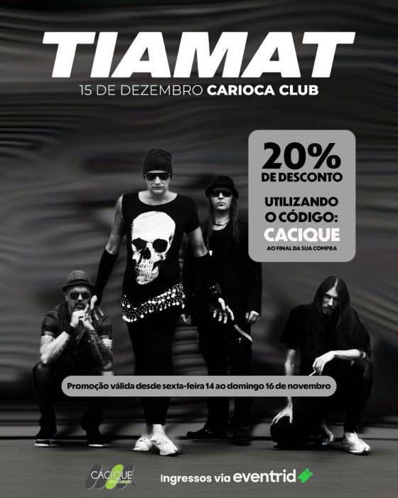 Para celebrar a contagem regressiva, a produtora Cacique Entertainment, responsável por todos os shows do Tiamat na América Latina, liberou um cupom de 20% de desconto válido por tempo limitado (de 14 a 16/11) na compra de ingressos. Para ter o desconto, utilize o código ‘Cacique’ ao final da compra: https://eventr.id/